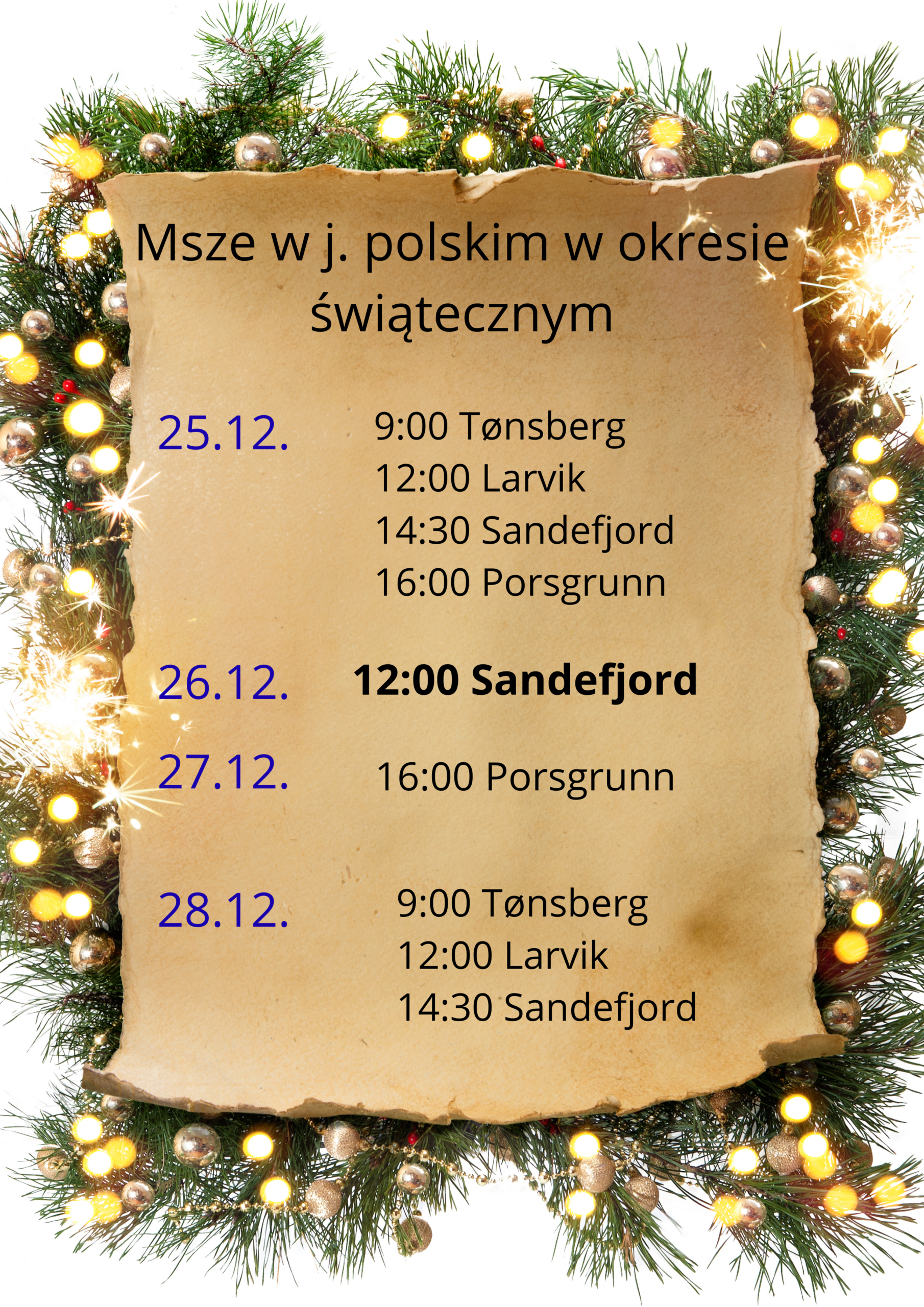 Sandefjord – tutaj od 9.11. nastąpiła zmiana i od tej pory Msza święta o godz. 14.30. Przesunięcie nastąpiło na prośbę proboszcza z Sandefjord.